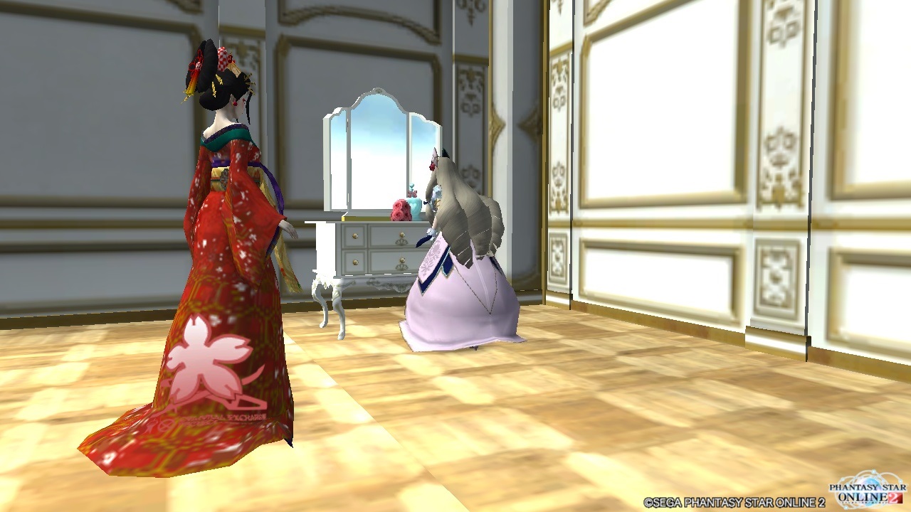 お出かけ(仮装パーテイか何か?)のために、おめかしをしているお嬢さん二人。